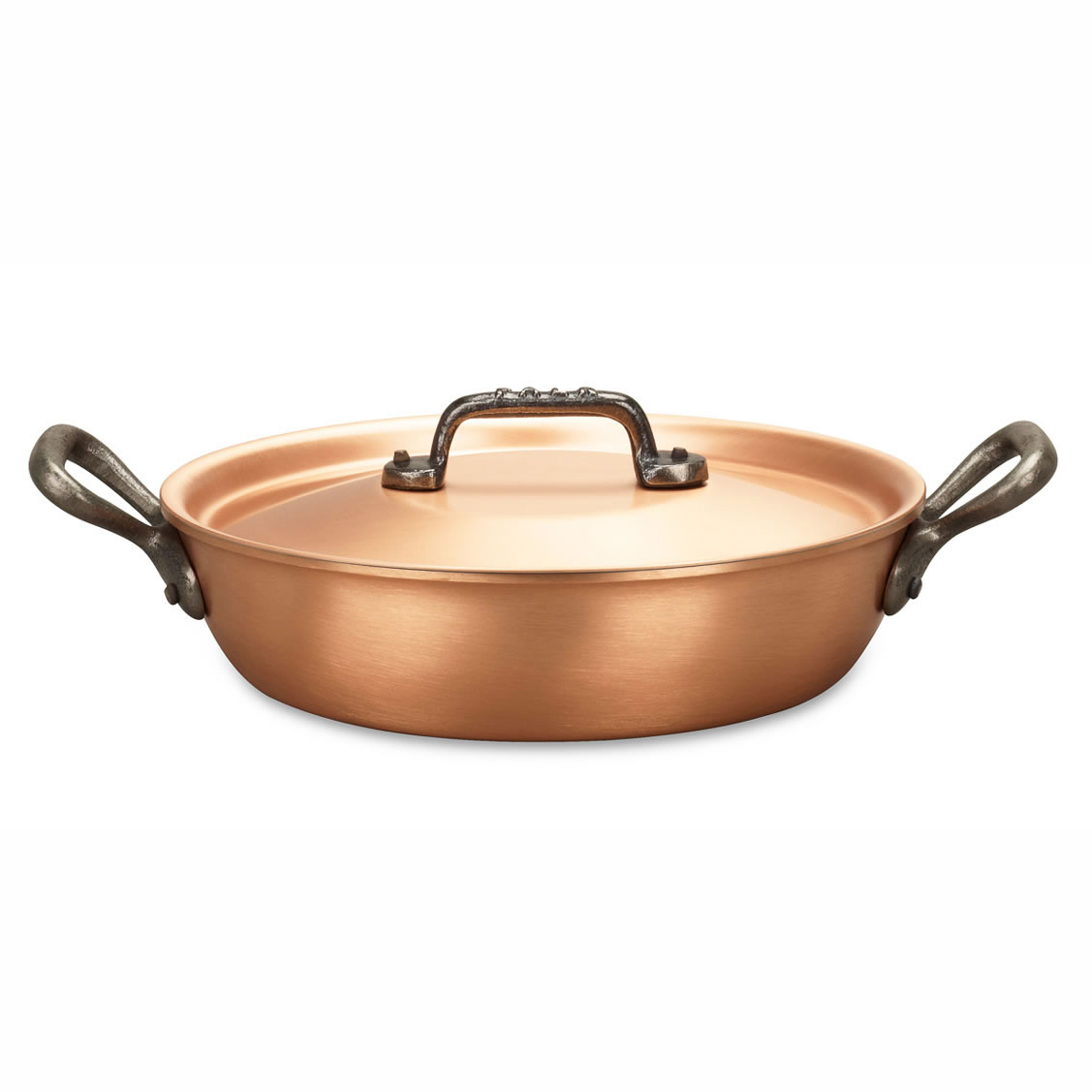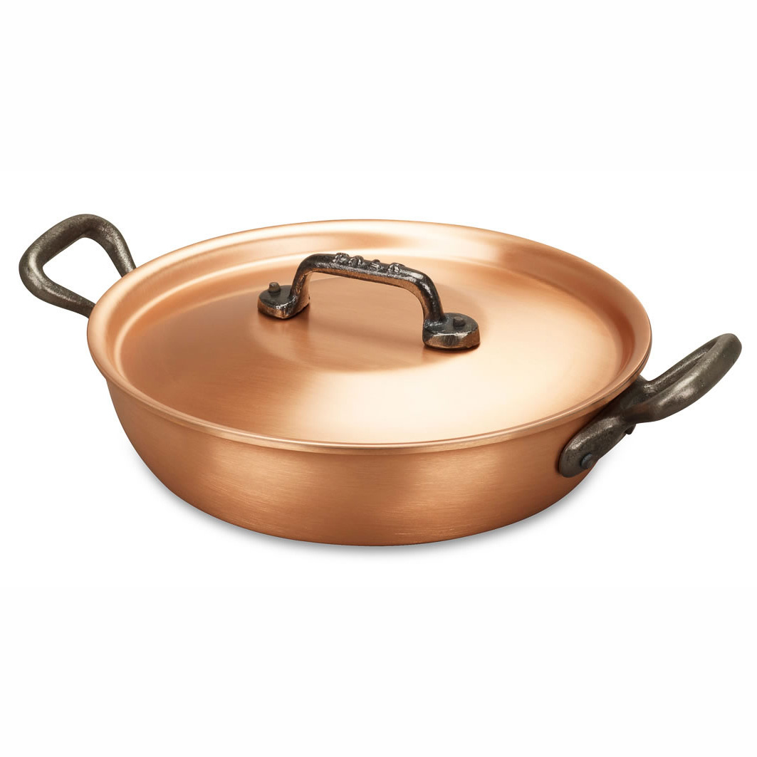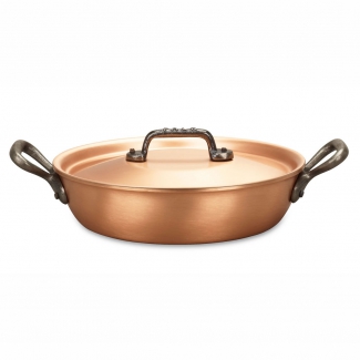 Благодаря низким стенкам сковороды продукты в такой посуде при использовании ее в духовке приобретут красивую хрустящую корочку. Двойные ручки позволяют легко использовать эту сковороду, как на газовой плите, так и в духовке. А медная поверхность придает ей очень красивый и эстетичный вид, благодаря чему в ней не стыдно подавать блюда даже на самый изысканный стол.