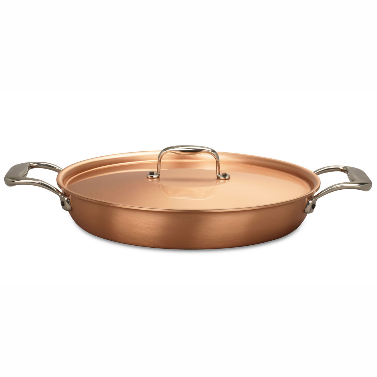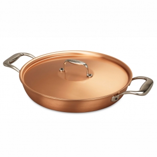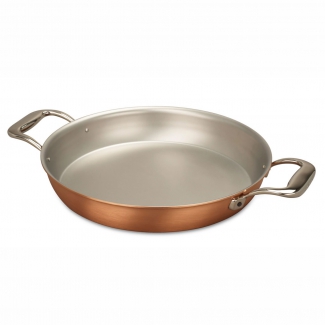 Благодаря низким стенкам сковороды продукты в такой посуде при использовании ее в духовке приобретут красивую хрустящую корочку. Двойные ручки позволяют легко использовать эту сковороду, как на газовой плите, так и в духовке. А медная поверхность придает ей очень красивый и эстетичный вид, благодаря чему в ней не стыдно подавать блюда даже на самый изысканный стол.