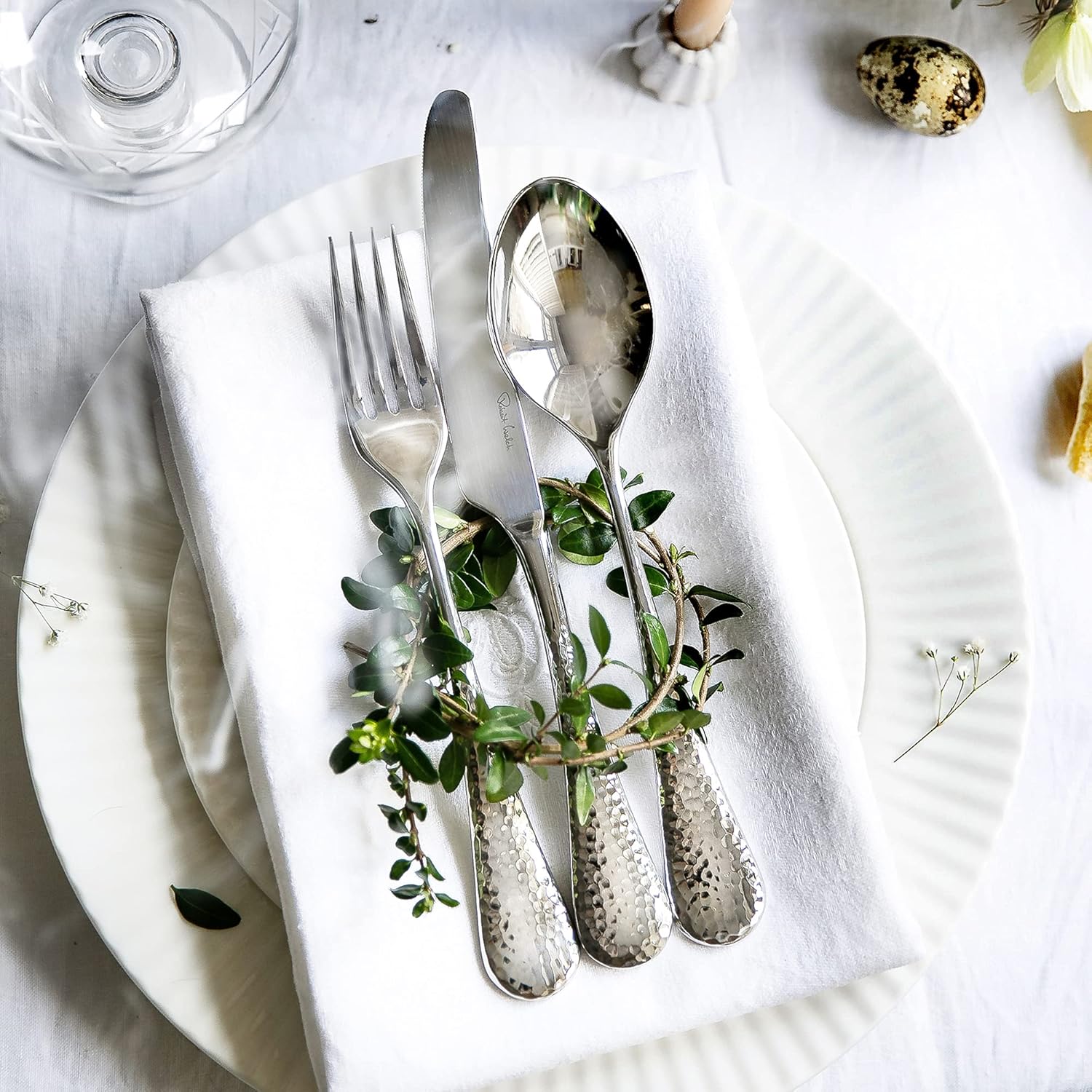 Столовые предметы Robert Welch стали символом английской элегантности. В коллекции Honeyboume удалось воплотить давнюю мечту - воссоздать в стальных столовых приборах традиционную технику обработки серебра, где главным инструментом выступал специальный молоток. В результате драгоценный метал становился не только гладким и блестящим, но и текстурным. В набор из 24 переметов входит 6 столовых ножей, 6 столовых вилок, 6 ложек для горячих блюд и 6 чайных ложек. Высокоуглеродная нержавеющая сталь из которой изготовлены приборы, гарантирует долгий срок службы. Приборы можно мыть в посудомоечной машине. Купить столовые приборы Robert Welch Киев. Купить столовые приборы Роберт Велш в Киеве. Студия сервировки стола VENDOME Киев, бульвар Леси Украинки, 30. Телефон: +38(068)650-22-33