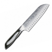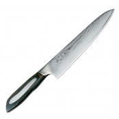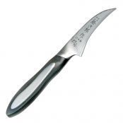 Лезвие ножей Tojiro Flash создано из нескольких слоев высокопрочной стали VG-10 в обкладках из дамаска, и обладает твердостью закалки в 60Hrc. Количество слоев стали в ножах Tojiro Flash - от 37 до 63, что делает клинок особенно прочным и приспособленным к большим объемам работ. Режущая кромка заточена симметрично и с двух сторон, что делает нож очень удобным для постоянной эксплуатации. Хвостовик клинка вмонтирован в рукоять и дополнен накладкой из нержавеющей стали, поэтому нагрузка распределяется равномерно, что способствует оптимальному балансу. Ручка сделана из микарта черного цвета, материала который не впитывает запахи, не боится влаги и не вступает в реакцию с химическими веществами. Плотность микарта гораздо выше, чем у дерева, благодаря чему ручка не скользит в ладони. Ножи Tojiro Flash – незаменимые помощники на любой кухне. Они идеально подойдут не только, как приобретение домой или на кухню ресторана, но и станут просто бесподобным подарком. Такой презент по достоинству оценит любая хозяйка. Кстати, ножи хороши в качестве подарков мужчинам, особенно ножи от фирмы Tojiro, ведь они сделаны в лучших традициях изготовления самурайских клинков.