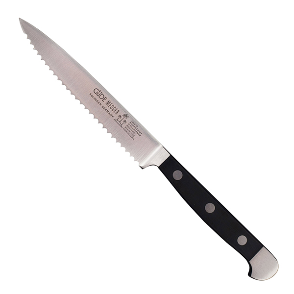 Нож для томатов – нож с длинным лезвием и волнистой поверхностью режущей кромки, предназначенный для нарезания овощей и фруктов. Форма лезвия ножа позволяет аккуратно разрезать твердую кожицу, не раздавив при этом мякоть. Купить Güde в Киеве. Купить ножи со скидкой в Киеве. Ножи по хорошей цене в Киеве. Купить немецкие ножи в Киеве. VENDOME Киев. Студия сервировки стола VENDOME Киев. +38(068) 650 22 33