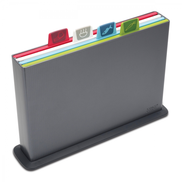 Этот инновационный набор разделочных досок «Index Chopping Board Set» – сэкономит время и поможет соблюсти все нормы гигиены. Каждая из досок в комплекте предназначена для определенной цели: для мяса, рыбы и морепродуктов, овощей, выпечки. Цветовая классификация и специальные ярлычки, которые изображены на досках, позволяют сразу достать то, что необходимо. Кроме того, приборы оснащены новыми специализированными функциями для резки: