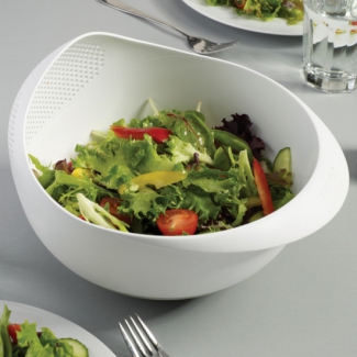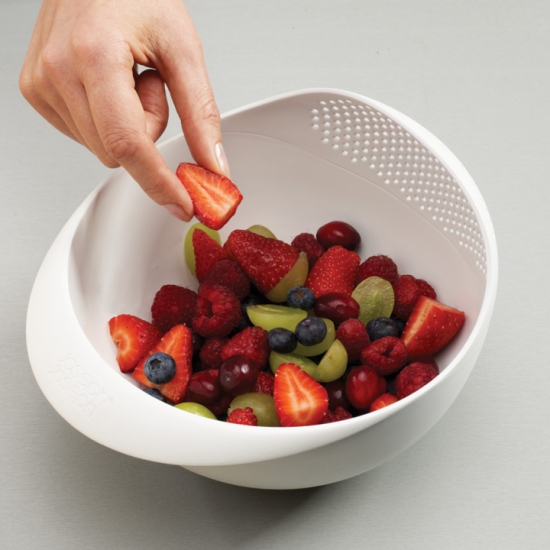 «Prep&Serve Small» – простой и стильный продукт от британского бренда Joseph Joseph, сочетающий в себе функции и миски, и дуршлага, и даже сервировочного блюда. Миска и дуршлаг 2в1. Больше не придется тягаться сразу с несколькими емкостями. Все, что нужно – положить продукты в миску-дуршлаг, залить водой и чуть наклонить, дабы вода благополучно отправилась в раковину. После того как жидкость полностью сольется, можно смело сочетать продукты с другими ингредиентами, например, для приготовления салата, и подавать к столу. Она отлично подходит для сервировки салатов, промывания мягких фруктов, полоскания риса и прочих круп. Купить Joseph Joseph. Купить джозеф. Студия сервировки стола VENDOME Киев, бульвар Леси Украинки, 30. Телефон: +38(068)650-22-33