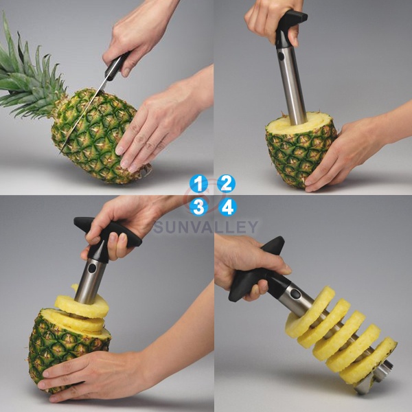 Оригинальная, запатентованная Vacu Vin ананасорезка очищает, удаляет сердцевину и нарезает ананас на сегменты всего за 30 секунд. Она вкручивается как отвертка, отделяя мякоть ровными кольцами и оставляя жесткую сердцевину в оболочке. Один поворот отделяет одно кольцо, также можно нарезать весь ананас сразу. Используя насадку-клинорезку Вы можете одним легким движением разрезать мякоть ананаса на равные сегменты. Клинорезку можно поворачивать обоими сторонами, а удобные ручки-ушки по бокам помогают контролировать ее движение по ананасовым кольцам. Новая ручка удобна в обращении и отделяется нажатием одной кнопки. Оболочка ананаса остается неповрежденной и может использоваться для сервировки десерта или фруктового салата.
